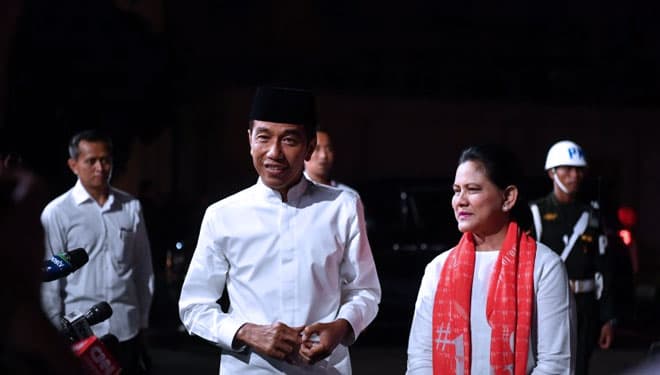 TIMES Bali/Capres nomor urut 01 Joko Widodo bersama istri Iriana Joko Widodo tiba di lokasi untuk mengikuti debat Pilpres 2019 putaran kelima, di Hotel Sultan, Jakarta, Sabtu (13/4/2019). (FOTO: Rivan Awal Lingga/Antarafoto)