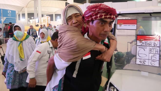 TIMES Bali/Petugas PPIH menggendong jemaah risti di bandara KAIA Jeddah, jelang pulang ke tanah air. (FOTO : istimewa).